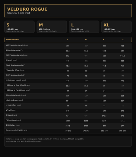 In its standard setup the Rogue runs as a trail-taming weapon, while alternate flip-chip configurations open the door to a more all-mountain feel or a more aggressive enduro-focused personality. The platform supports mixed-wheel or full 29-inch compatibility, and it is built around Velduro's carbon monocoque frame architecture and I-Track suspension concept.