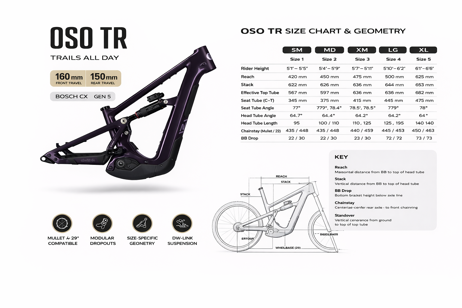 Med 160 mm fjädringsväg fram och 150 mm bak, uppnår den den perfekta balansen mellan klättringseffektivitet och utförsåkningsförtroende. Från snabba kvällsturer till fullskaliga äventyr i vildmarken är Oso TR byggd för att ta dig överallt.