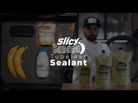 ”Mmm, känner du lukten? Slicy Banans Smoothy Tubelessvätska är lika effektiv som den luktar gott. Den bananluktande vätskan tätar upp till 6mm hål och rinner lätt och smidigt i däcken för snabb tätning”